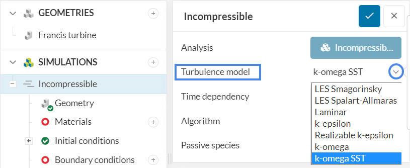 The k-omega turbulence model needs to be chosen at the beginning of the simulation setup inside the global settings panel. This is shown in the figure below: