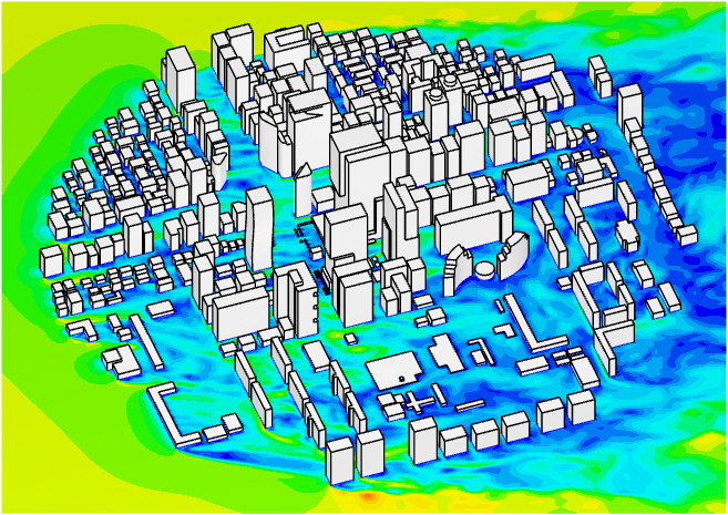For an incompressible LBM analysis, the meshing is based on the lattice Boltzmann method (LBM) and is quite different from the finite-volume based fluid dynamics analysis types in SimScale. Here a cartesian background mesh is generated, which is composed only of cube elements that are not necessarily aligned with the geometry of the buildings or the terrain.