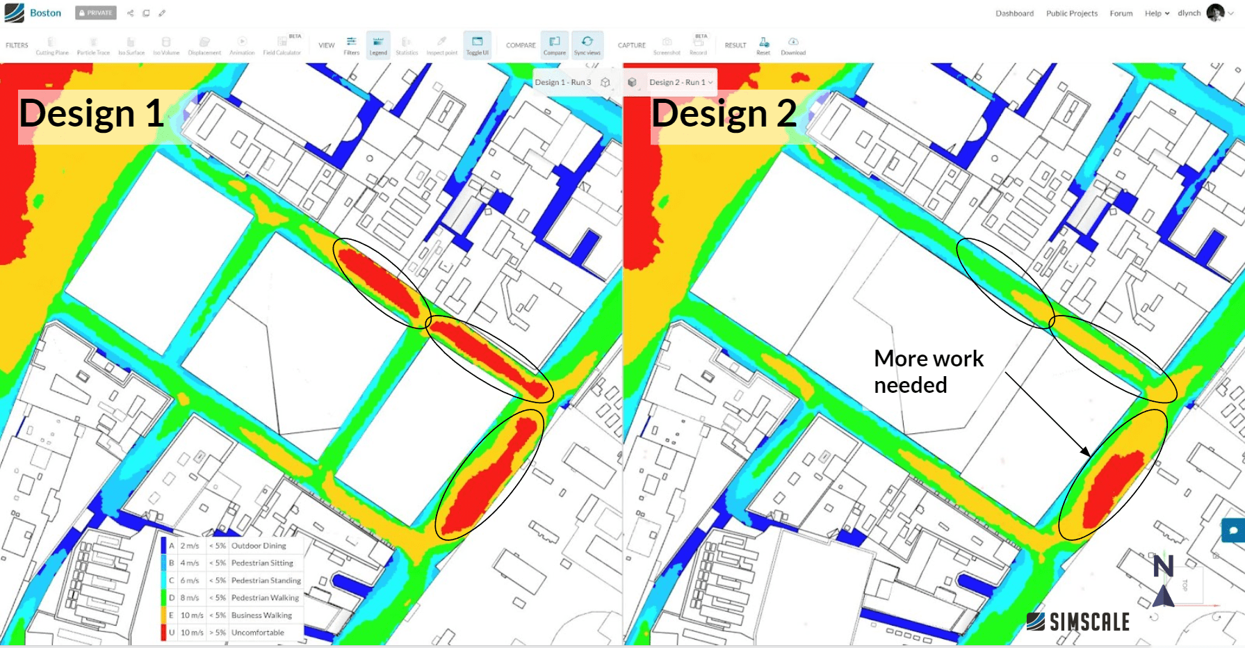 In this Boston example, a glass canopy is proposed to deflect the unwanted high-velocity downwash from the larger building that was identified in the baseline PWC analysis. This simple geometry change was made and the case was quickly reevaluated. As seen in the comparative results below, the canopy was effective at reducing the unwanted high winds in the alleyway on the North side of the building, though more iterating is still required to improve the conditions to the East.