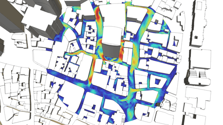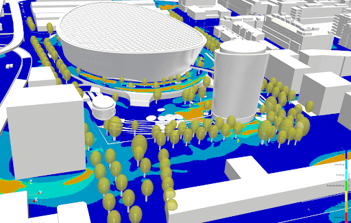 SimScale is a cloud-native simulation platform for architects and engineers, accessed through a web browser. One of the most popular features of SimScale is its robust CAD handling features for building- and city-scale models, including complex geometry from Revit. Architects and engineers working on proposed developments can bring in as-designed CAD models. This spares designers the need to spend extensive time and resources on CAD clean-up to make the models simulation-ready. The lattice Boltzmann method (LBM) solver Pacefish©, integrated into SimScale for external wind studies, provides an automated meshing experience that is versatile in dealing with common CAD issues such as intersections, holes, and terrain.