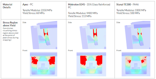 Even if the above-yield stress observed on the model was reduced, an overall significant impact was not shown. Here, designers might consider material changes, in addition to shape iterations. Apec, Makrolon 8345, and Stanyl TE300 were tested as alternatives for the lid.