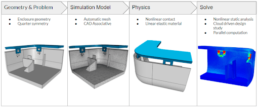 The simulation workflow in SimScale, which can be repeated and applied to many different use-cases, starts by uploading a solid body CAD geometry to the platform. By using automatic body meshing, the model is quickly ready for simulation. Though the geometry of this case study was relatively uncomplicated, the physics used within the structural analysis is complex. With SimScale, capturing valuable insights from complex simulations is simpler and easier to share within teams and organizations, even with varying levels of simulation expertise. Below, the workflow for a nonlinear static analysis is represented. As SimScale facilitates a cloud-driven design study, users can leverage parallel computation and solve both a higher number of design iterations and more iterations of increased complexity.