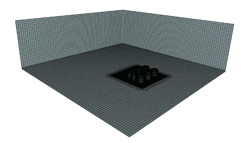 A virtual wind tunnel was modeled using a hexahedral-dominant mesh, with the tank farm in the middle. The mesh was computed in the SimScale platform, resulting in 1.5 million cells: