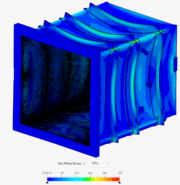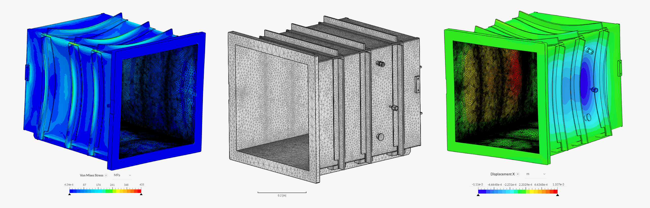Samco used the structural (FEA) analysis type in SimScale to understand the product lifetime of their Plasma Cleaner (PC-1100 and AQ-2000). Samco originally designed the PC-1100 based on its own experience 20 years ago. The project aimed to confirm what the product’s lifetime might be under realistic operating conditions and extend it by making design modifications. A static structural analysis was performed on the vacuum chamber of the Plasma Cleaner. The iCAD geometry was imported as a STEP file into SimScale, which can handle multiple CAD formats. The bottom of the vacuum chamber assembly was set as a fixed boundary and then a high vacuum simulated by applying a pressure equivalent to atmospheric pressure to the inner surface acting inwards.