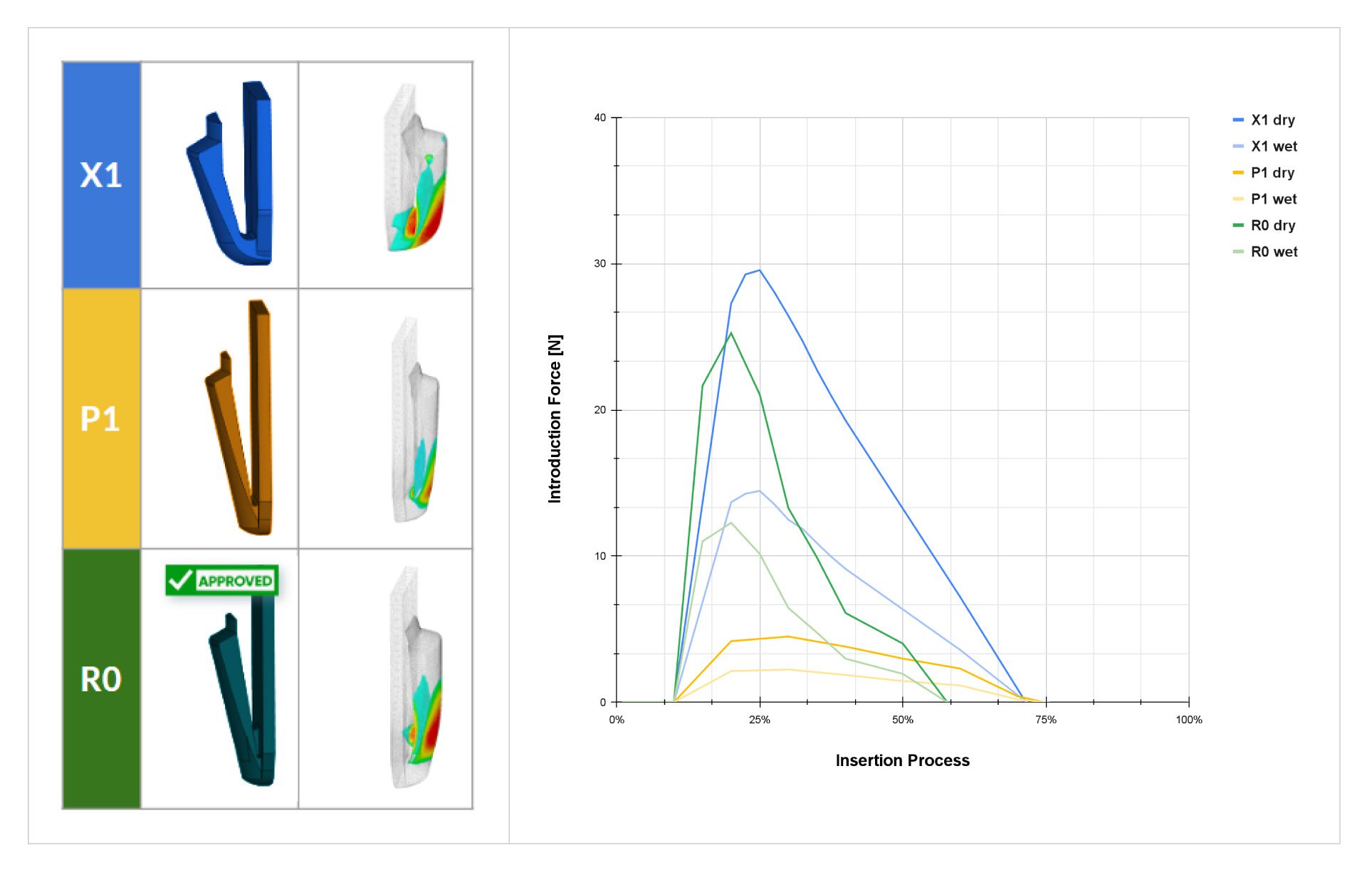 A second design iteration is made to the long anchor clip (P1) resulting in R0. The aim is to further reduce the insertion force to below 30 Newtons by increasing the thickness of the anchor clip by 0.1 mm and adding a central rib (shown in red in the middle image below). The end result (R0) has three modifications over P1 resulting in 25.6 Newtons insertion stress, below the 30 N target. The insertion force has decreased to below the target level whilst maintaining the extraction force needed. Multiple configurations were simulated in parallel using SimScale to arrive at this final solution that was then prototyped for further physical testing. For each design, two different elastoplastic curves were used to model the behavior of the polyamide material reflecting dry and wet conditions that impact material performance. Its material properties are dependent on ambient moisture content that must be accounted for in testing. Simulation and testing must include a wide range of environmental parameters including temperature and humidity.