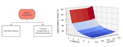 The initial parameters of interest for such studies usually are the temperature of the battery coolant and flow rate. For this study, Rimac limited the design space to the inlet flow velocity of the coolant and the thermal conductivity of the electrical insulator.