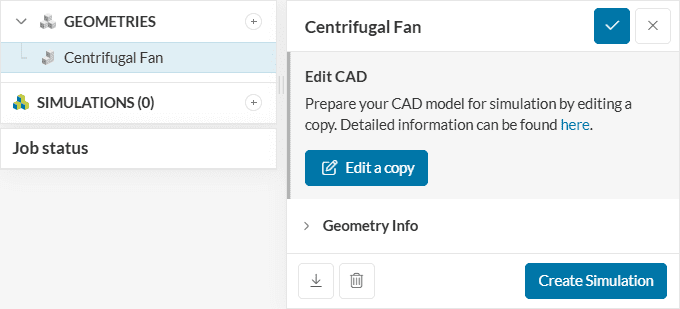 The Geometry section allows you to view and select the CAD model required for the simulation. It is important that the CAD model is well prepared to avoid any meshing or simulation related errors. Find more details on CAD preparation and upload here.
