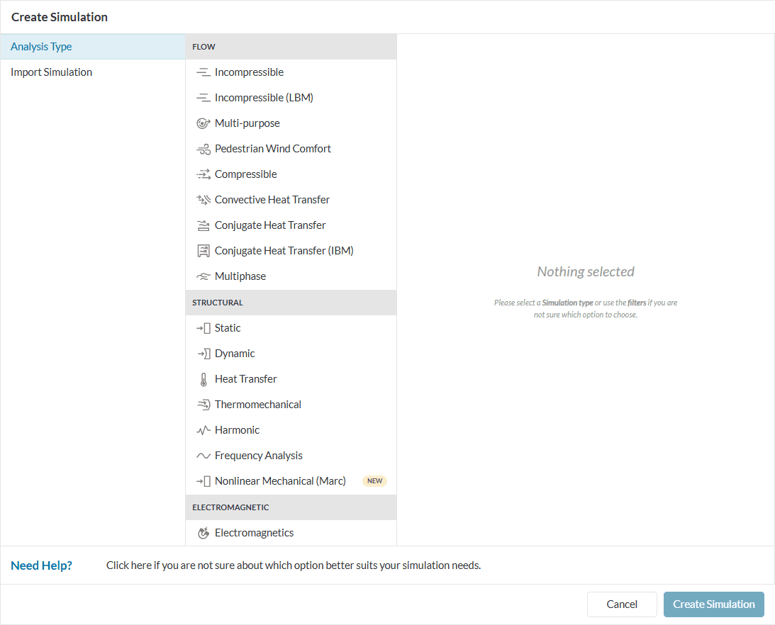 This page provides a general information on how to setup a simulation. Some elements in the simulation tree will only be available for certain analysis types, for example, contacts will only be available for structural analysis. Know more about individual analysis types here.