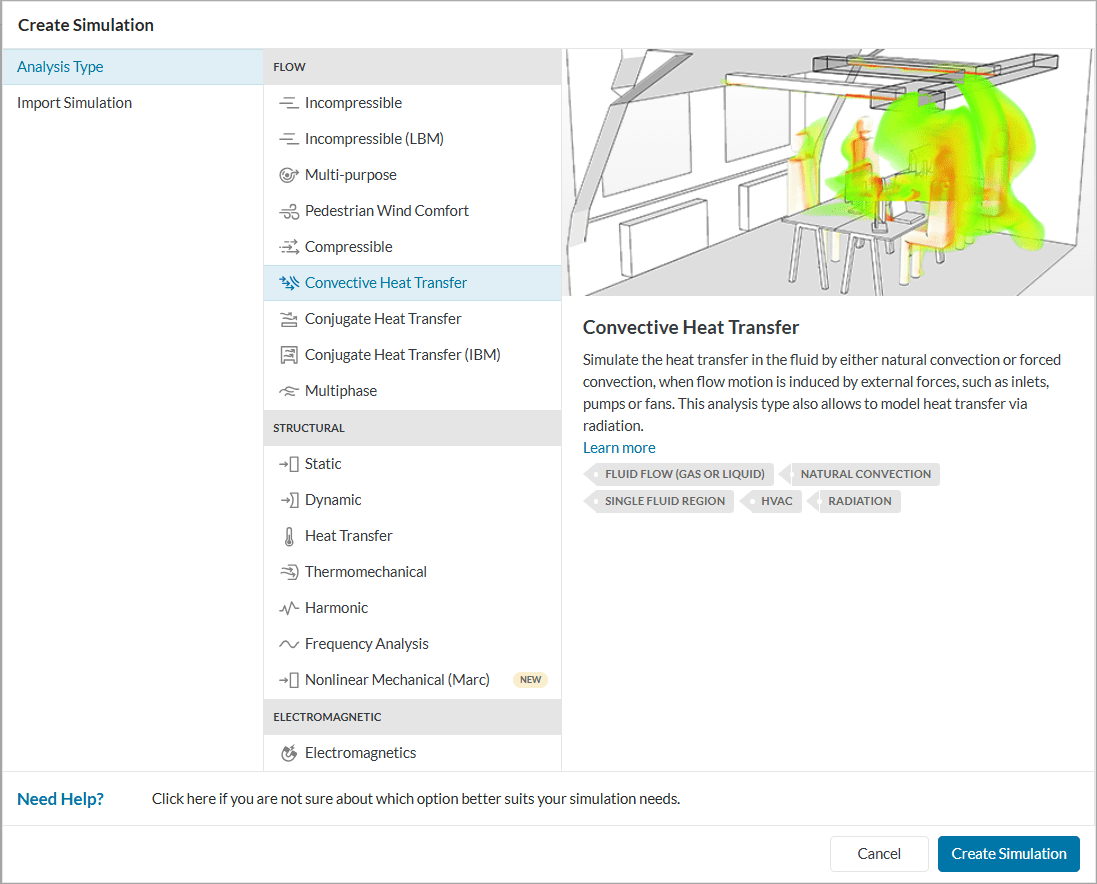 To create a convective heat transfer analysis, the first step is to select the desired geometry and then click on ‘Create Simulation‘: