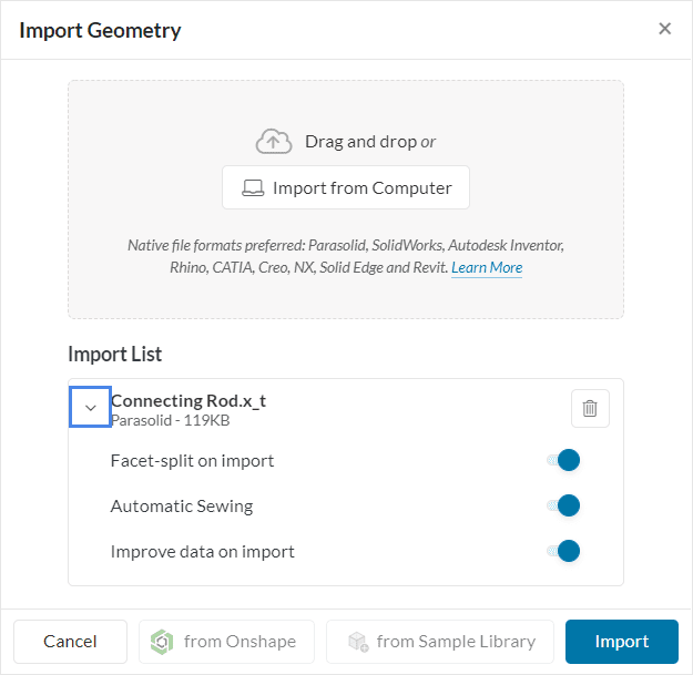 Another option is to use the ‘from Onshape’ button to directly pull a design from your Onshape library. Additionally, sample CAD models are available by selecting the ‘from Sample Library’ button.