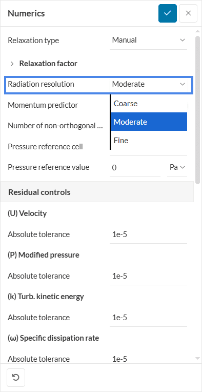 For radiative heat transfer problems, further settings can be changed within the numerics, as shown in the picture below. Most importantly, the radiation resolution can be changed. This affects the discretization of the directions for which the radiative problem is solved. The settings are coarse, moderate, and fine. Increasing the radiation resolution will lead to a higher number of directions and hence improved angular discretization of the radiative problem (usually a more accurate result).