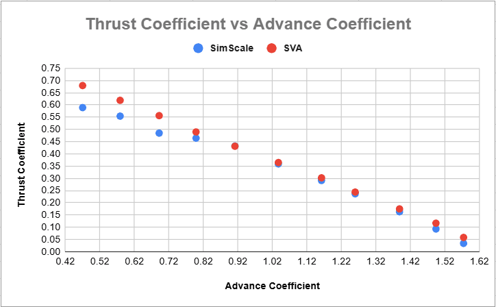 The result output for thrust and torque exerted by the propeller and the propeller efficiency obtained from the SimScale simulation are compared with the experimental measurements reported in the SVA study\(^1\).