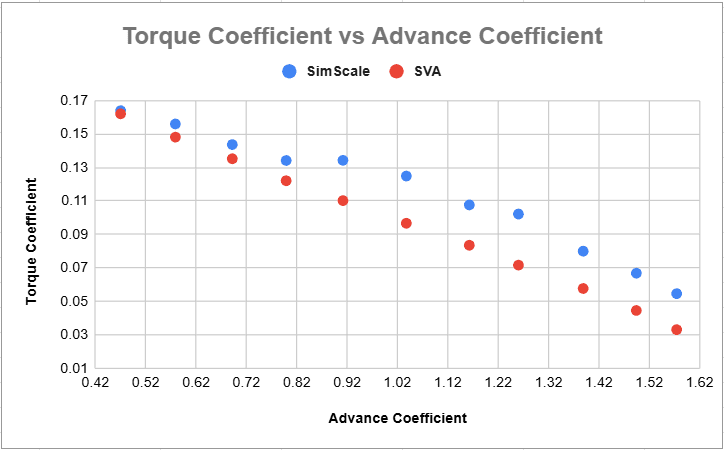 | Velocity \([m/s]\) | Advance Coefficient | Torque, Simscale \([Nm]\) | Torque Coefficient, SimScale | Torque Coefficient, SVA | Error % |