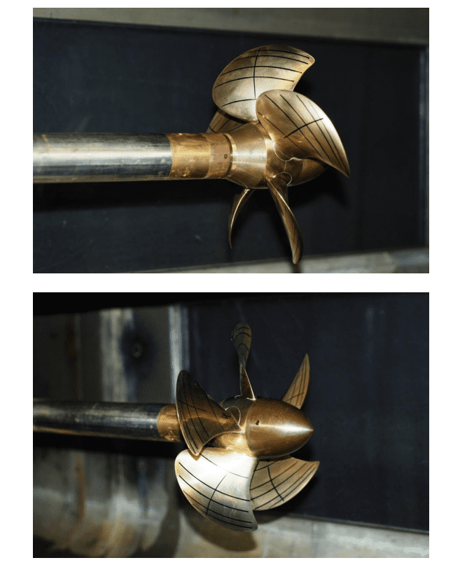The Propeller model VP1304 can be downloaded from the SVA PPTC smp’11 Workshop. For simulation purposes in SimScale, an external flow volume is created around the propeller to replicate a propeller immersed under water. The original Propeller VP1304 as mentioned in the SVA report\(^1\) is as shown in Figure 1: