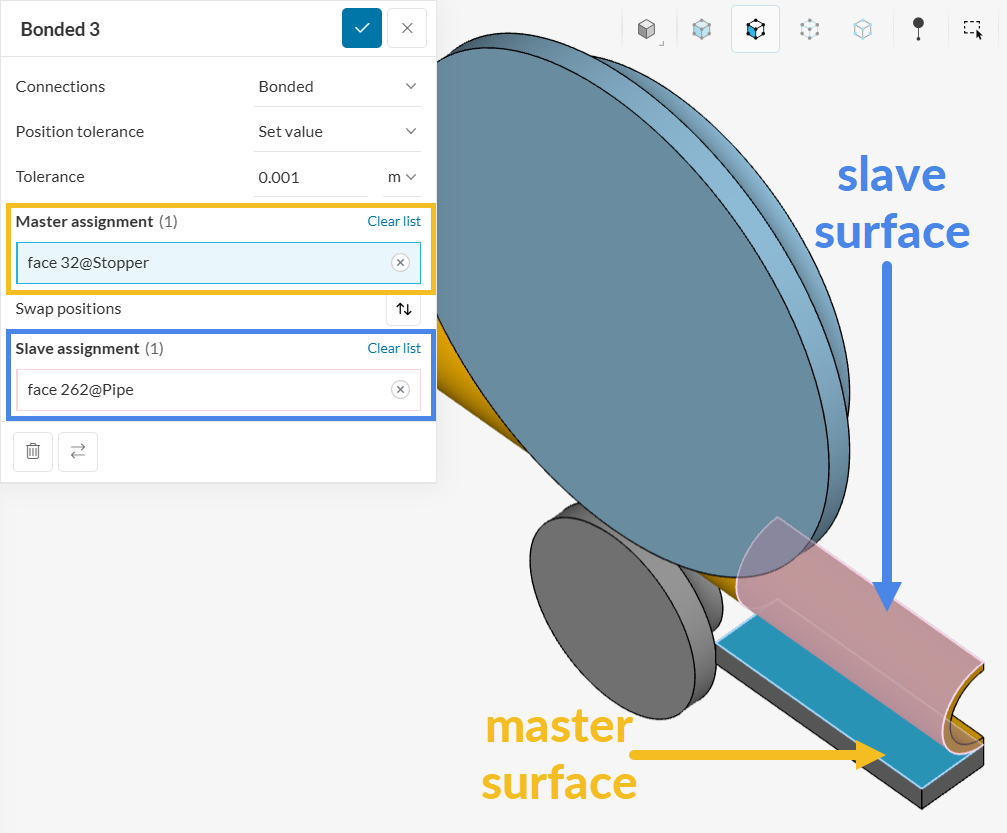 For Bonded 3, ensure the correct faces are assigned to the Master and Slave assignments, namely, the bottom face of the stopper and the pipe’s face in contact with it: