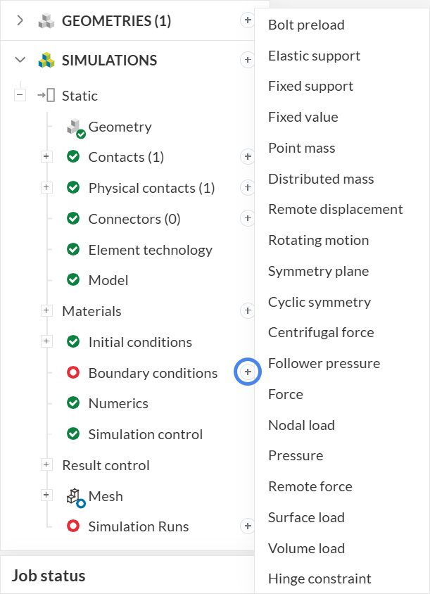 To create a boundary condition, click the + button next to Boundary conditions in the left panel, then select the required boundary condition type from the drop-down menu, as shown in the figure: