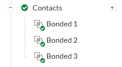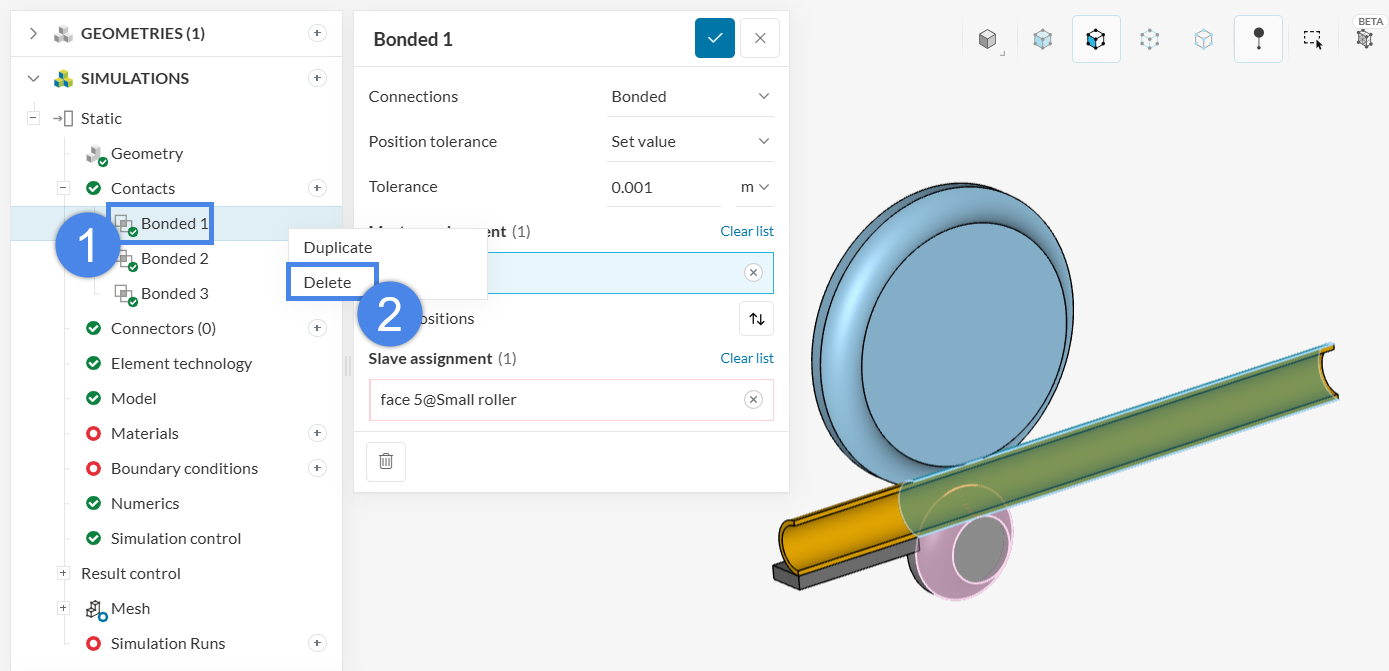 SimScale automatically detects touching faces or edges in the geometry and assigns bonded contacts by default. In this case, the three contacts listed above are detected: