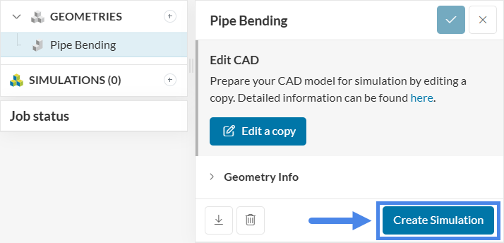 To begin the simulation setup, use the Create Simulation button located in the geometry dialog box. This opens the simulation creation panel where analysis types can be selected.