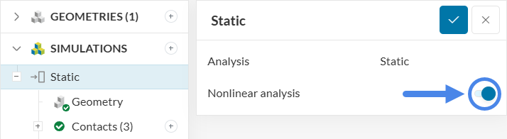 In the simulation properties window that opens, enable the Nonlinear analysis option: