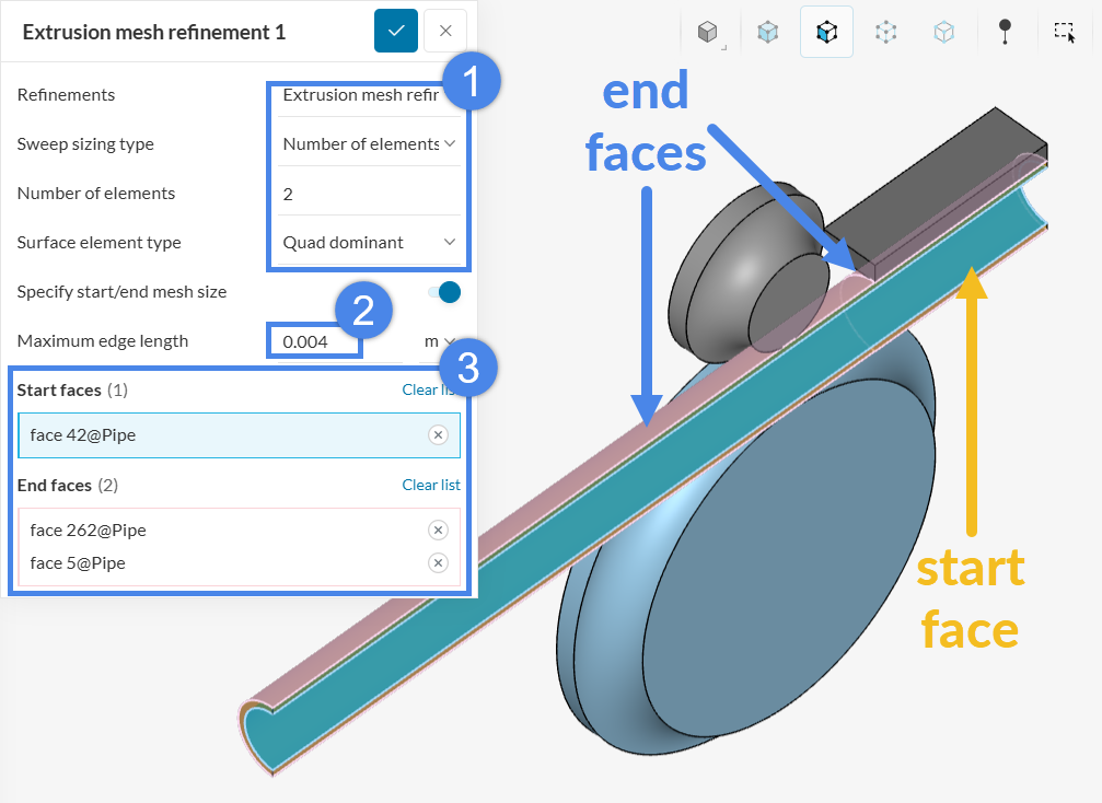 Apply an Extrusion mesh refinement to the indicated faces of the pipe (Figure 31). The mesh is generated on the start face and then extruded through the thickness direction to the end faces (note that the outer face is split in two). After selecting the start and end faces, set the Sweep sizing type to Number of elements along sweep, set the value to 2, and set the Surface element type to Quad dominant. To increase surface fineness, enable Specify start/end mesh size and set a Maximum edge length of 4e-3m.