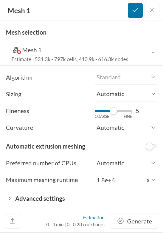 There is no need to generate the mesh at this point, as it will be computed as part of the simulation run. When mesh computation is complete, it will be marked with a green check-mark icon. The mesh can then be opened to review the final result: