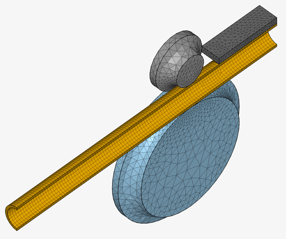 This tutorial simulates the forming process of an aluminium pipe using a hydraulic bending machine and evaluates the mechanical stress and strain induced in the part(s). The image below illustrates the model components and the process: