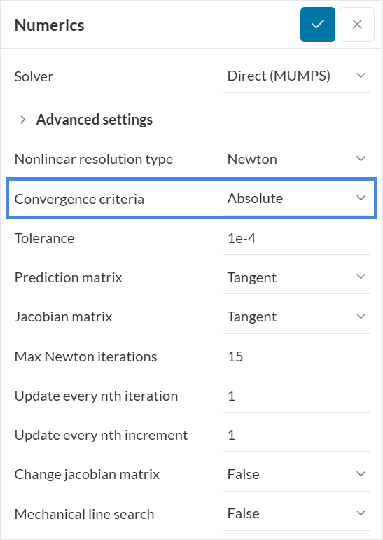 The Numerics parameters control solver behavior and precision. In this case, only one parameter needs to be changed: Convergence criteria. The default Relative criteria use the applied load magnitude to check convergence. That approach does not work here because the model is driven by an imposed displacement, so no loads are defined. Change the criteria to Absolute, as shown in the image: