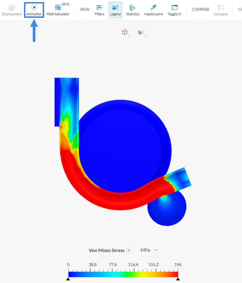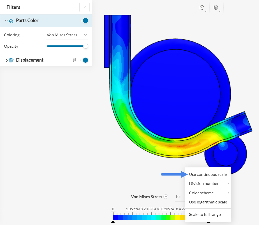 After the solution fields load, Von Mises Stress is selected by default as Coloring under Parts Color and is plotted on the deformed shape using Displacement for the last time step. Right-click the legend bar and select Use Continuous Scale to display a smoother result visualization.