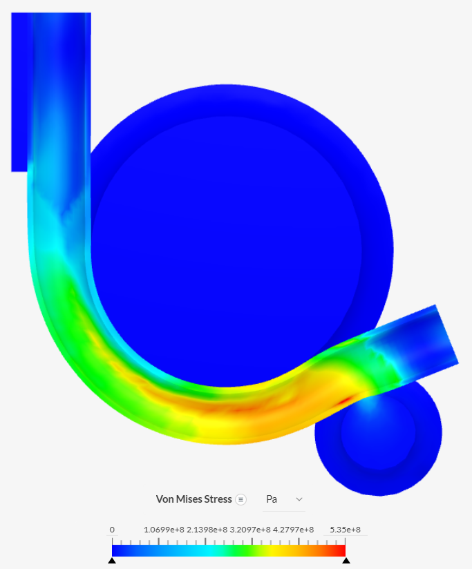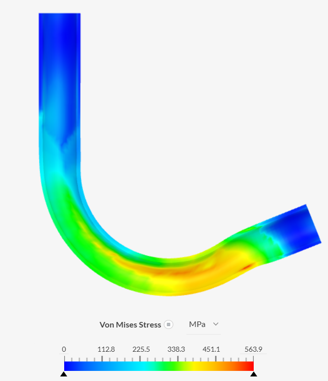 The stress distribution on the bent pipe can now be inspected without other parts obstructing the view. Higher stress levels occur on the outer portion of the pipe, close to the contact region with the roller.