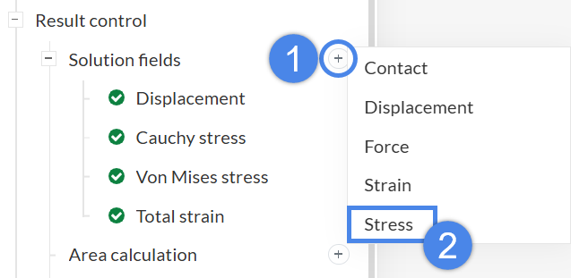 Result control defines which result fields are written during the simulation, such as displacements, strains, and stresses, along with characteristics such as average or maximum values. Several default fields are provided, but additional fields are required for this case: