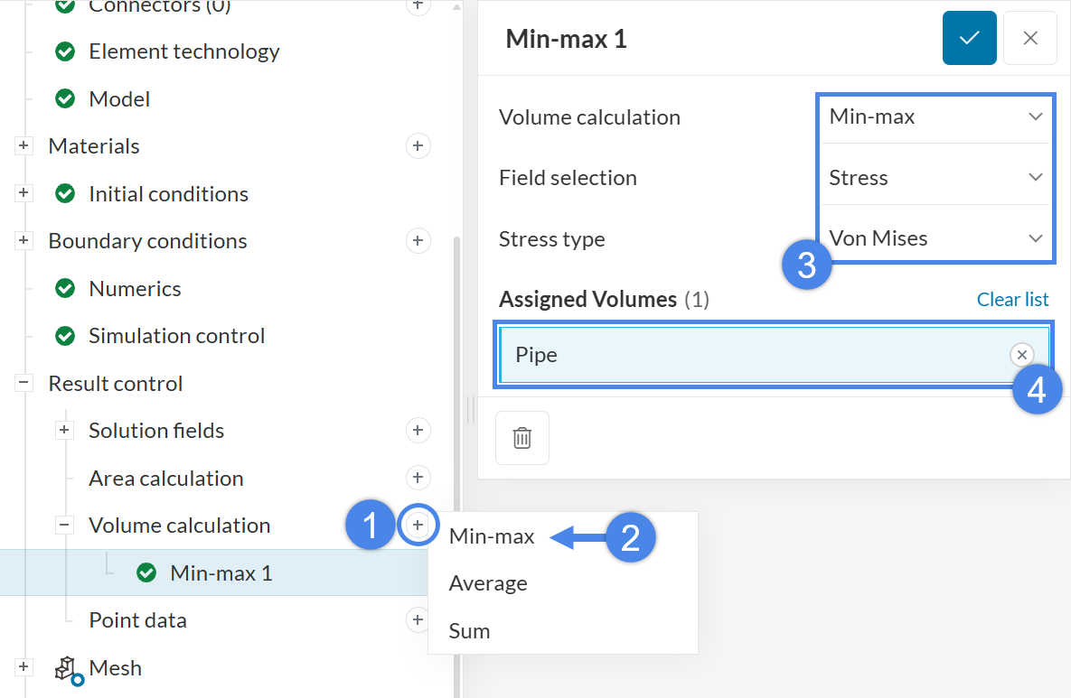 Use the steps above to create a Volume calculation – Min-max item and set it up for the von Mises stress field over the pipe, as shown in the image: