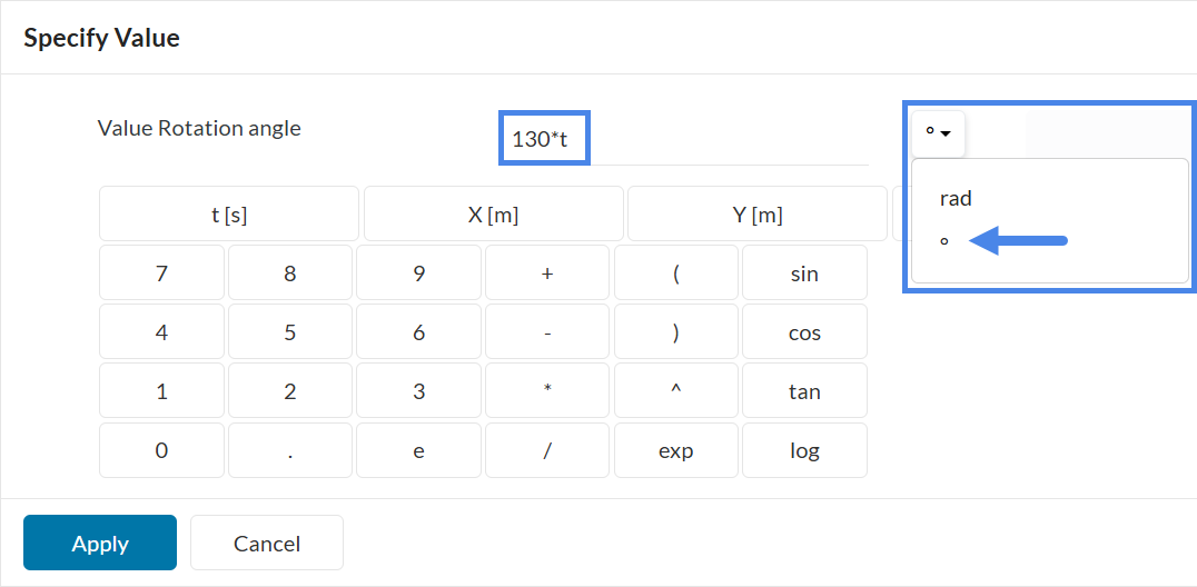 The Specify value window appears. Enter the formula as shown in Figure 23 and change the unit from rad to º.