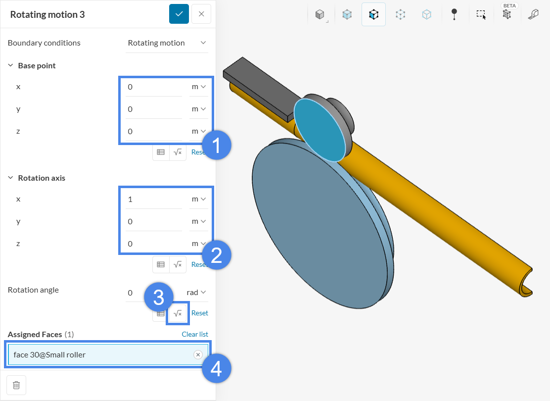 In this model, the rotation axis passes through the origin and is oriented in the X-direction. For other models, obtain the axis position and orientation from CAD and enter them in the boundary condition. Create the Rotating motion and assign the top face of the Small roller. Set up the parameters as shown: