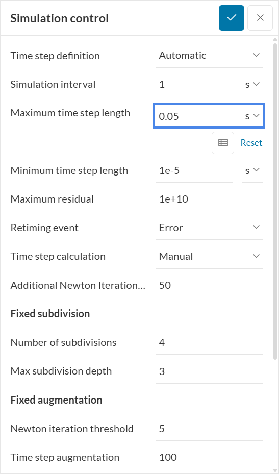 Leave the Simulation interval at the default value of 1 \(s\). This means the simulation runs from 0 to 1 \(s\), matching the interval used to define the roller rotation. Set the Maximum time step length to 0.05 \(s\) to obtain 20 integration steps in the [0,1] \(s\) interval.